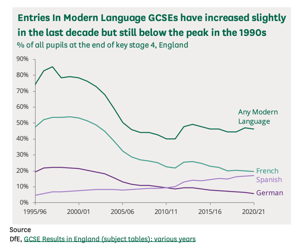 The big drop in languages came not with Brexit but the mid-1990s when globalisation and technology started to speed up. But since 2010, the GCSE story has been one of revival in the study of modern languages, not decline – reflecting a country that is more, not less, interested and connected with the wider world. The story with A-Level languages is one of slower but steady decline, with no post-2010 revival. Brexit is irrelevant to both trends.