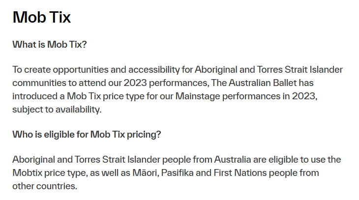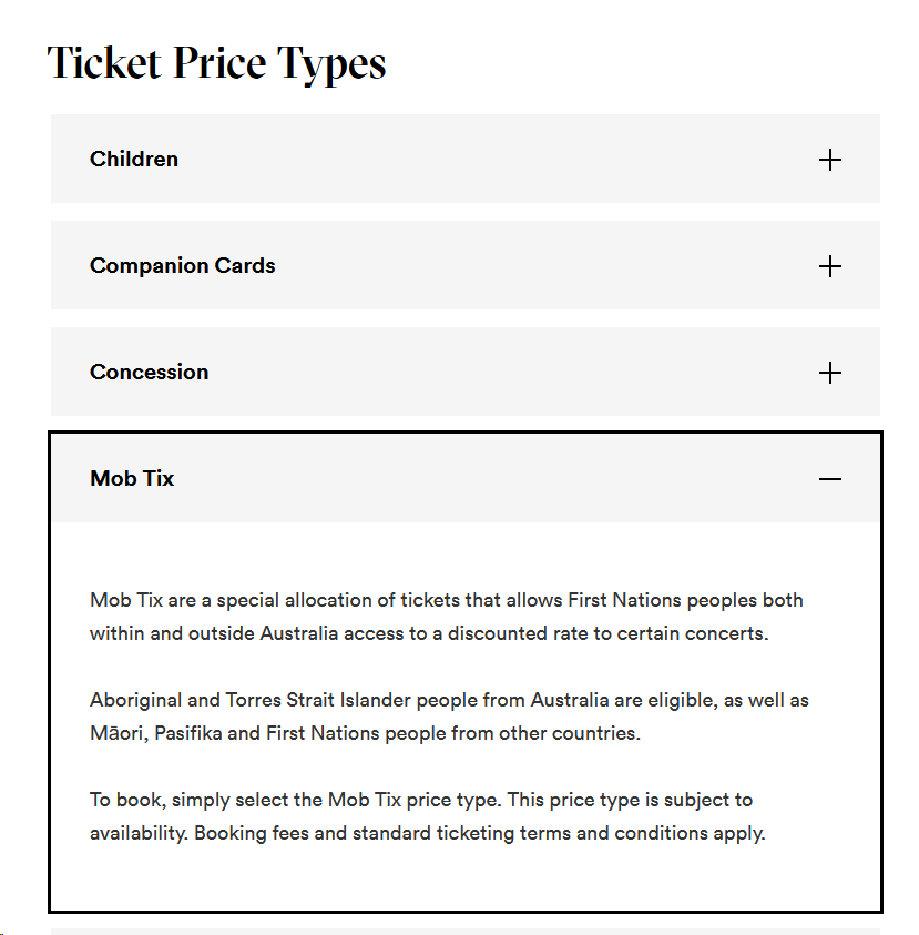 But it doesn’t end there, because the Sydney Symphony Orchestra (SSO) is not alone in this egregious pricing scheme. Subject to availability and buried within its Terms and Conditions, the Melbourne Symphony Orchestra (MSO) also offers what it calls Mob Tix: discounted ticketing that isn’t just available to Aboriginal Australians but to ‘Māori, Pasifika and First Nations people from other countries as well’.