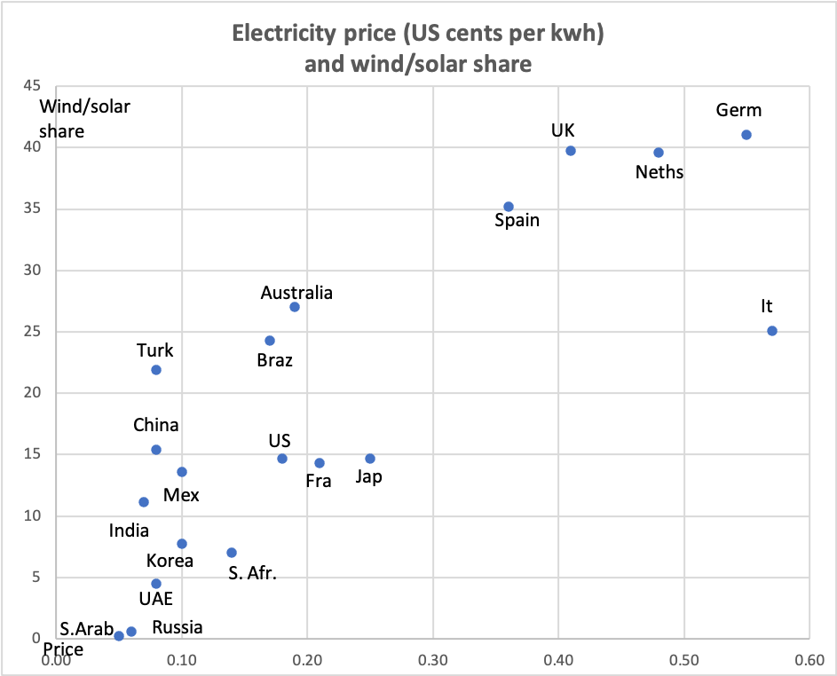 The readily available data by country for the wind and solar renewables share and price of electricity show a high share of renewables is concomitant with high electricity costs. The cheapest electricity is found in the nations with the lowest renewable energy share: Saudi Arabia, Russia, India, UAE and Korea. Germany, the UK, the Netherlands, Spain and Italy have high prices and high renewables shares.