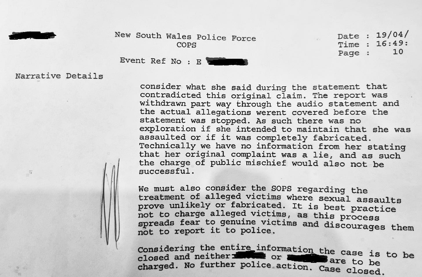 To return just briefly to that meta-analysis of statistical studies which relied mainly upon cases where police found ‘strong evidential grounds’ for false allegations. The police have a huge disincentive to identify and confirm such grounds because they appear to be under instructions not to take action over false allegations. I’d long heard from families of accused men and also from police about these instructions. Lo and behold, I recently received proof in the form of a case note from the NSW Police Force referring to this standard operating procedure in a case where no action was taken with a likely false accuser. Here it is…