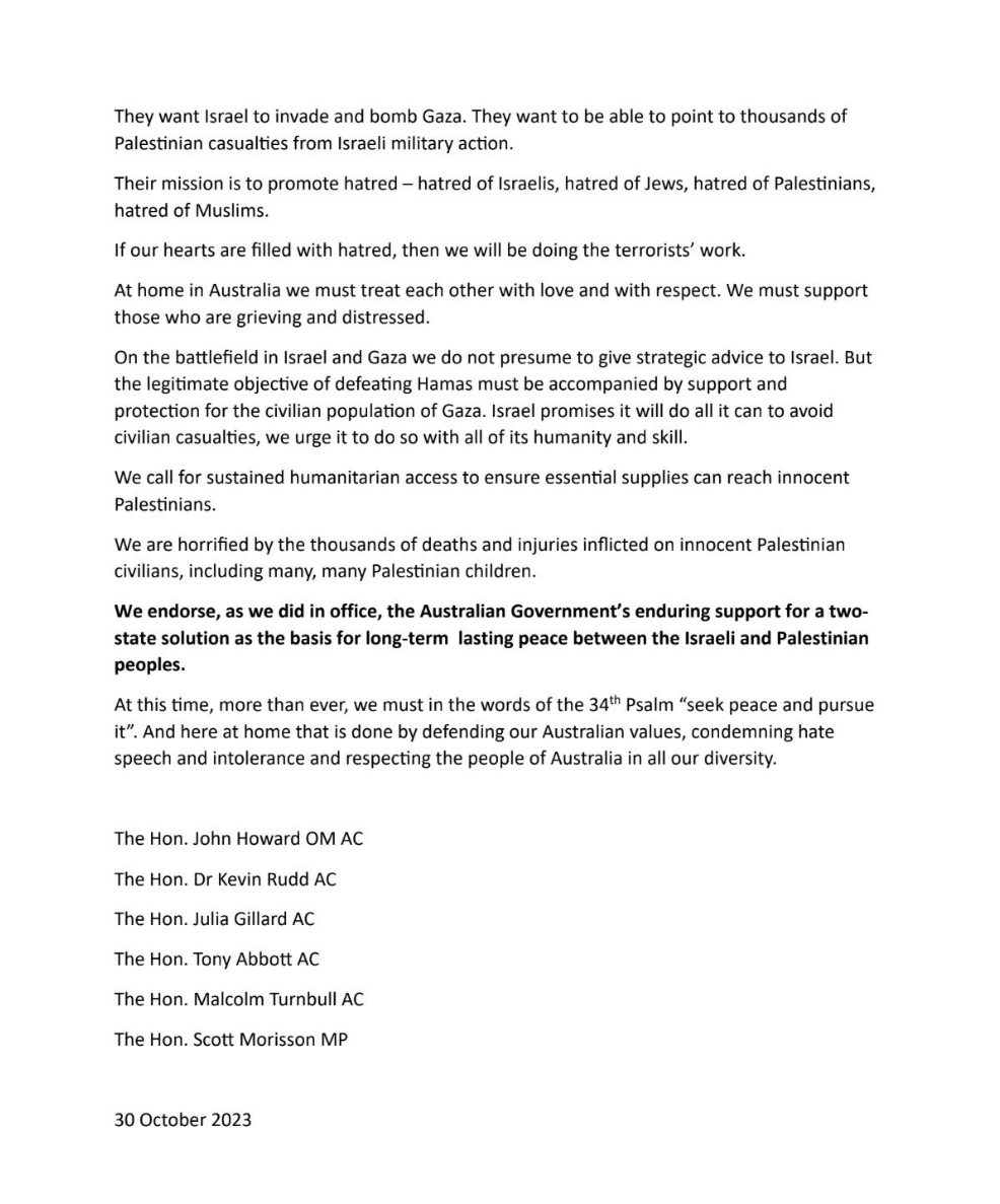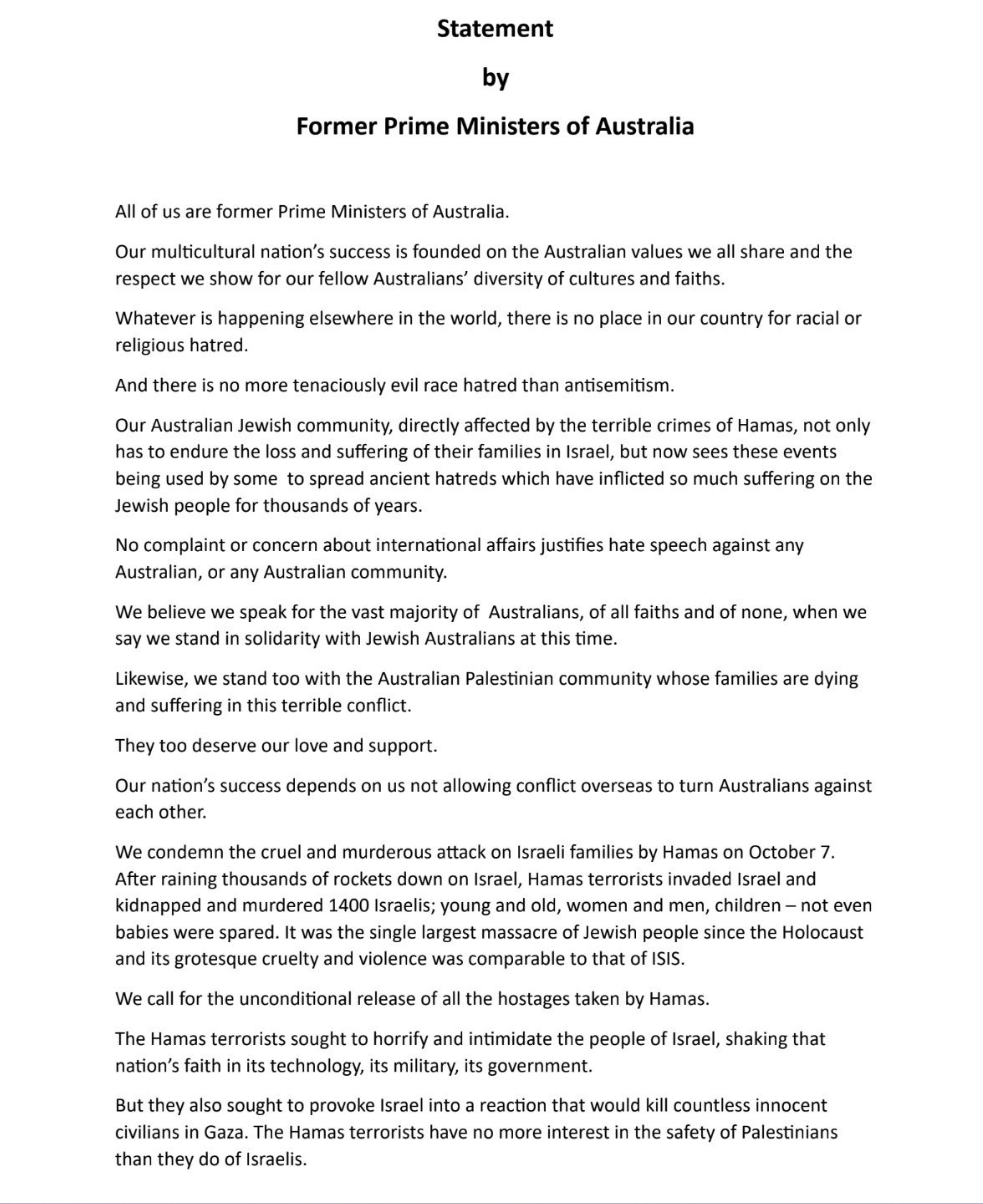 Six former Australian Prime Ministers, notably excluding Labor Prime Minister Paul Keating, have written and signed a two-page letter condemning the rapid spread of hatred by Palestinian-based terror group Hamas.