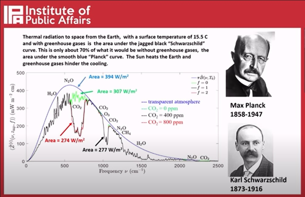 More than 100 years ago, German physicist Max Planck figured out radiation from a ‘blackbody’, beginning what is now known as quantum mechanics. The measurements that Happer et al. made fell within standard predictions of that physics. But more importantly, they discovered that the atmospheric greenhouse gases reduced the emissions into space. This is due to the effects that certain features of those molecules (their vibrational and rotational states and Karl Schwarzschild’s research) have on the emissions at various wavelengths, particularly in the infrared. In total those features reduce the amount of radiation into space by about 30 per cent less than would be radiated if there were no gasses such as carbon dioxide (CO2) and water vapour in the atmosphere. CO2 particularly has a very strong effect and it is easily observed how much it reduces emissions. In fact, without CO2 there would be way too much emission of heat into space and the Earth would be too cold to live on.