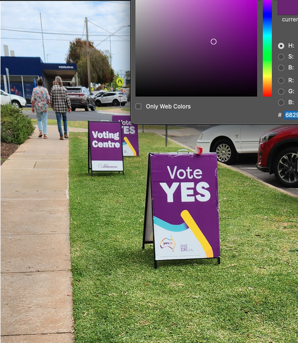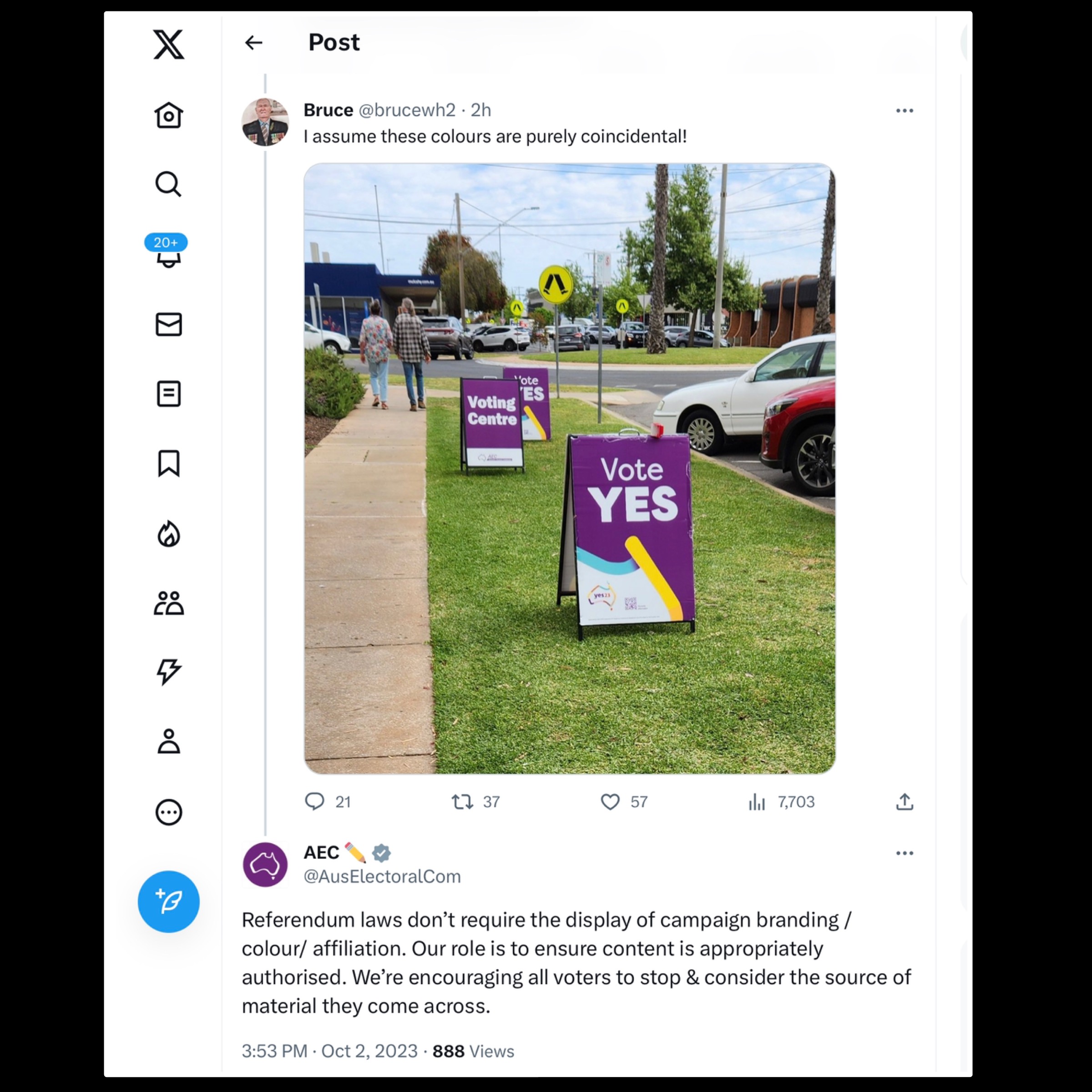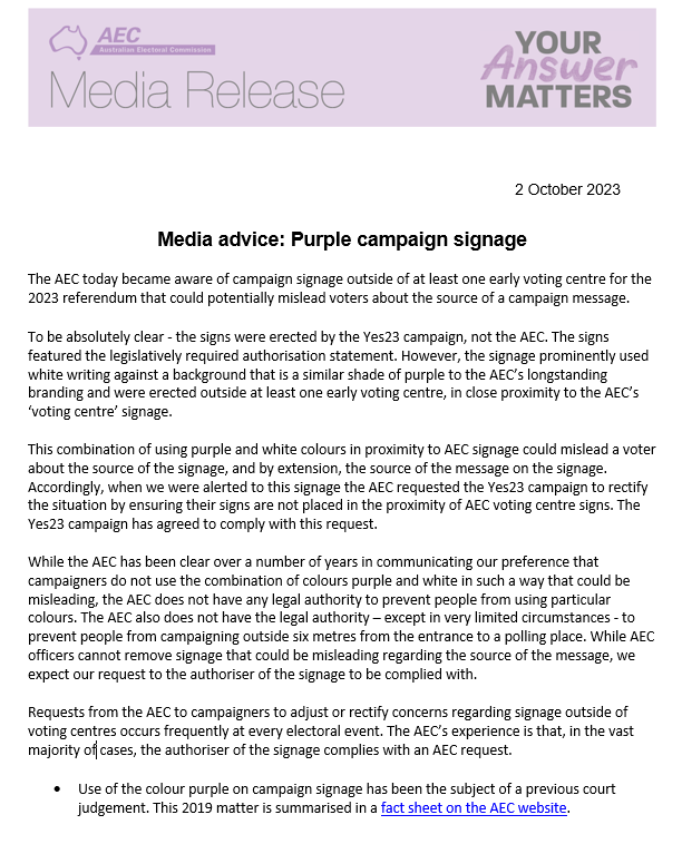 On October 2, people began posting photographs of Yes23 campaign signage colour-matched to the purple and white of the AEC scattered around early voting booths.