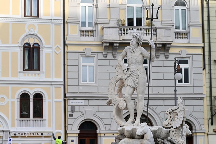 The uneasy groan, stutter, and clunking of the modern age rises through the square in Italy’s coastal port of Trieste.