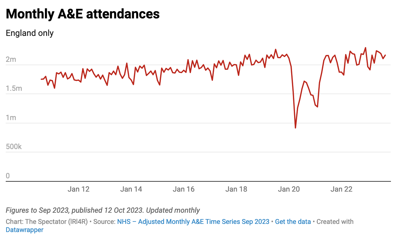 And the NHS more broadly? The Accident & Emergency wards were not overwhelmed: indeed the number of admissions halved. As we now know:-