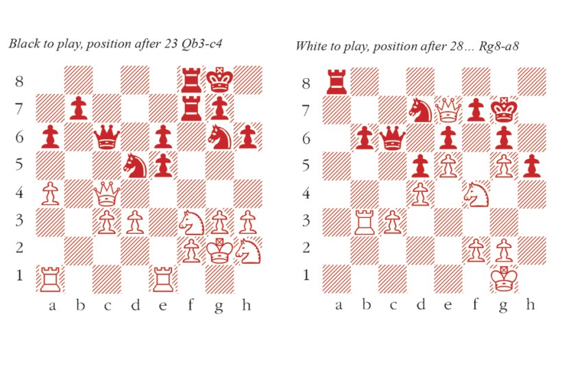1 e4 e5 2 Nf3 Nc6 3 Bc4 Nf6 4 d3 Bc5 5 c3 a6 6 a4 Ba7 7 O-O d6 8 Nbd2 O-O 9 h3 h6 10 Re1 Be6 11 b4 Ne7 12 Bxe6 fxe6 13 Nf1 Ng6 14 Be3 Bxe3 15 Rxe3 Rf7 16 Re1 Qe7 17 g3 Raf8 18 N1h2 d5 19 Kg2 c5! In a typical middlegame from the Italian Opening (signified by 3 Bc4), White’s kingside is well fortified against the massed Black forces. Adams finds a surprising way to increase the activity of his pieces. 20 bxc5 Qxc5 21 Qb3 Qc6 22 exd5 A safer choice was 22 Qb3-c2, securing the pawn on e4. Mrva had likely counted on 22…exd5 23 Rxe5! when capturing the rook walks into a knight fork on e5, but Adams’s response is far more venomous. Nxd5 23 Qc4 (see left diagram) The decisive mistake. 23 Re4 was still tenable, though 23…Ndf4+!? 24 gxf4 Nxf4+ 25 Kg1 Nxh3+ 26 Kg2 Nf4+ 27 Kg1 Nxd3 28 Qc4 Qd5!? continues to pose problems, with three pawns and ample activity for the knight. Rxf3! Everything falls into place. 24 Nxf3 Ndf4+ 25 gxf4 Nh4+ 26 Kf1 26 Kg1 was a decent try, since 26…Qxf3 is tempting but bad – after 27 Qxe6+ Kh8 28 Qg4, White is fine, since 28…Qxd3 won’t be check. Instead 26…Nxf3+ is stronger: 27 Kh1 Qxc4 28 dxc4 Nxe1 29 Rxe1 Rxf4 and Black should win the rook endgame. Qxf3 27 Qxe6+ Kh7 28 Qg4 Qxd3+ 29 Re2 Rxf4 30 Qg3 30 Qe6 Qf3 carries decisive threats. Qxg3 White resigns