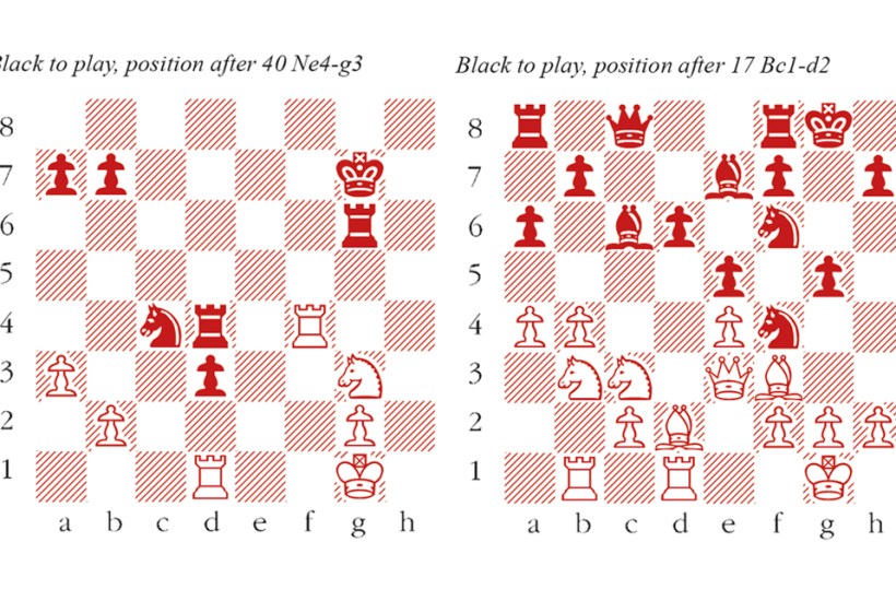 Under pressure, Dutch grandmaster Erwin L’Ami had just uncorked an important resource 40 Ne4-g3! (see above left) counting on 40…Rxf4 41 Nh5+! Kh6 42 Nxf4 with a likely draw. Short of time, and presumably frustrated, Vidit blundered with 40… Nxb2? expecting 41 Rxd4 Nxd1, which is also drawn. But L’Ami seized his opportunity with 41 Nf5+!