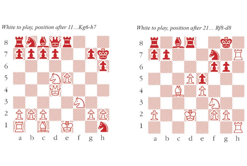 1 e4 e5 2 Nf3 Nf6 3 d4 Nxe4 4 dxe5 Bc5 5 Bc4 Nxf2 6 Bxf7+ Kxf7 7 Qd5+ Kg6 Black would like to play 7…Ke8 but after 8 Bg5 Be7 9 Bxe7 Qxe7 10 Kxf2 White’s easy development promises an advantage. 8 Qxc5 Nxh1 9 Nc3 h6  Radjabov is a whole rook up, but he is not so naive as to have given no thought to his king safety. It is likely he expected a draw by repetition, as has occurred a few times after 10 Qc4 Kh7 11 Qe4+ Kg8 12 Qd5+. But he was clearly unprepared for Theodorou’s next move, which asks more questions to the defender. 10 Nd5 Re8 11 Qd4 Kh7 (see diagram) 12 Bxh6!  Played instantly, so Theodorou was almost certainly still following his pre-game analysis. Radjabov’s next move seems to be the decisive mistake. Instead, 12…Nc6 probably survives, though Black must walk a tightrope right to the end, e.g. 13 Qf4 Rf8 14 Ng5+ Kxh6 15 Qh4+ Kg6 16 Qh7+ Kxg5 17 O-O-O g6 18 h4+ Kf5 19 g4+ Kxe5 20 Qg7+ Kd6 21 Nb4+ Ke6 22 Re1+ Kd6 23 Rd1+ with a draw. gxh6 13 O-O-O Re6 14 Nf6+ Kh8 15 Nh4 The attack is overwhelming. d6 16 Qf4 Kg7 17 Qg4+ Kh8 18 Ng6+ Kg7 19 Nf8+ A neat finale. Black resigns on account of 19…Kxf8 20 Qg8+ Ke7 21 Qg7 mate.
