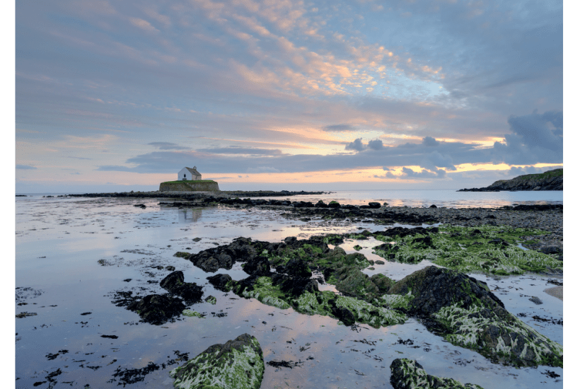 Another pilgrimage took us further north in Wales, to the holy isle of Anglesey, tracing the journey between Caernarfon, where the Romans set off to exterminate the last of the Druids in Britain, and Holyhead Mountain, the holiest place for Druids in western Europe at the time of the invasion around 60 ad. Here my companion Will and I composed a new song using a 3,000 year-old ancient Welsh lullaby, ‘Pais Dinogad’. The island of Llanddwyn and Porth Cwyfan made for dramatic sleeping spots, exposed to the elements and accompanied by remote holy wells, ruined chapels and a working church cut off by the tide. I also slept in a neolithic round barrow but ran out in the middle of the night, terrified by who knows what. I’d had a similar experience the year before in a prehistoric long barrow in Wiltshire.