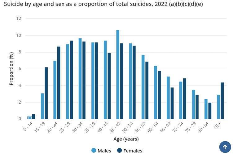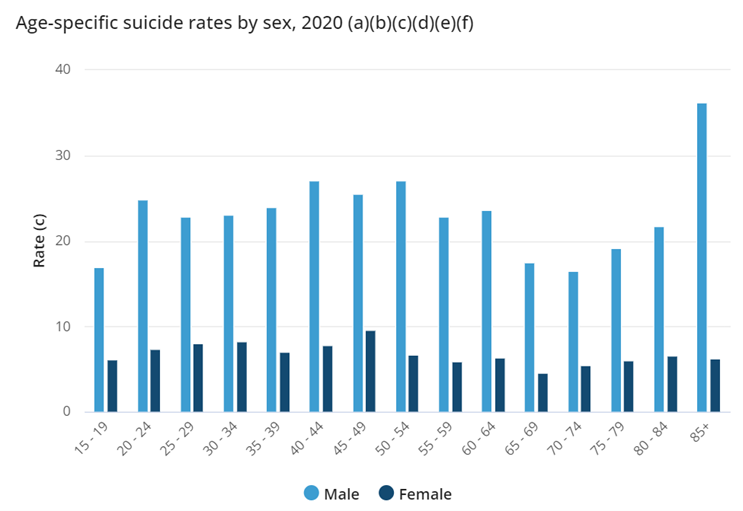 The ABS highlighted this telling graph in their reports on suicide trends until 2020 when it suddenly disappeared, to be replaced with two separate graphs – one for men and the other for women. The net effect of this change in the display of data obscures the reality that suicide is overwhelmingly a male problem.