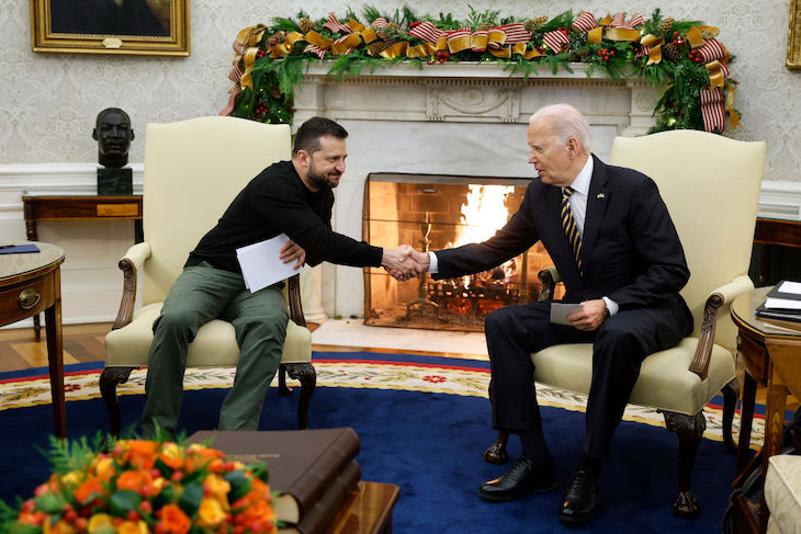 The bulk of Zelensky’s time was spent on Pennsylvania Avenue. His first stop was Capitol Hill, where he briefed senators on the state of the war, Ukraine’s strategy for winning it, and the weapons systems required to make that strategy a success. He was escorted by the top Democrat and Republican in the chamber, as if to signal to Putin that Ukraine still had bipartisan support. Senate majority leader Chuck Schumer emerged from the meeting to tell reporters that Zelensky ‘needs the aid quickly’ if the Ukrainians have any chance of winning the war. If not, the Russians could begin to see success again and the Ukrainian army will have adopt the tactics of an insurgency.