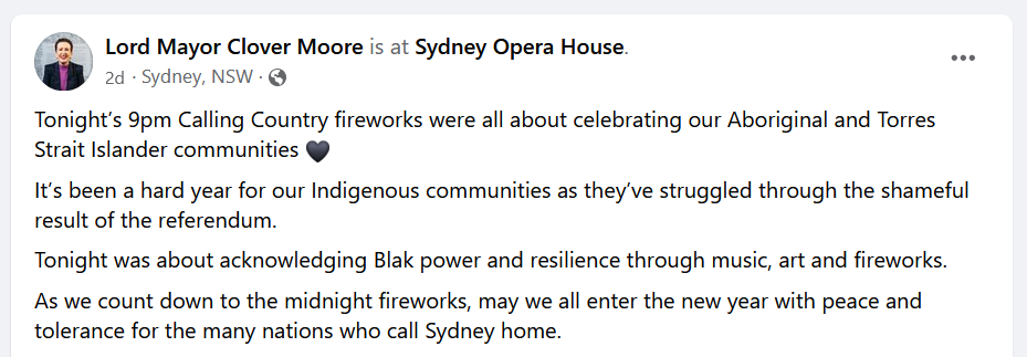 Clover Moore’s ‘Blak power’ New Year’s Eve fireworks (for kids?)
