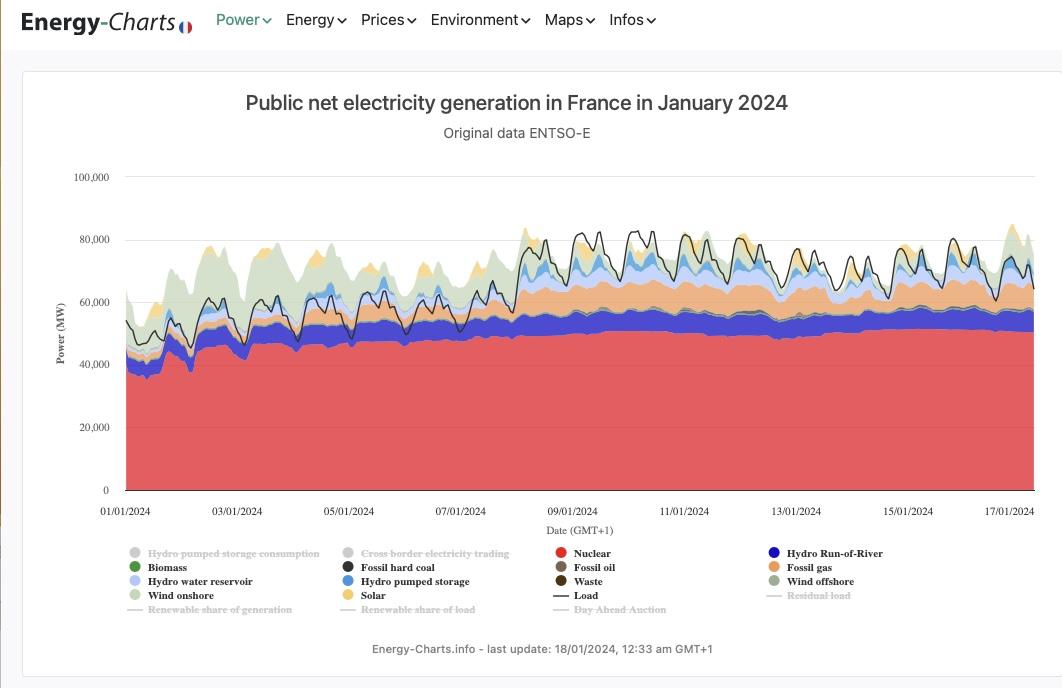 To illustrate, these two charts show the net electricity generation for Germany and France during January 2024: