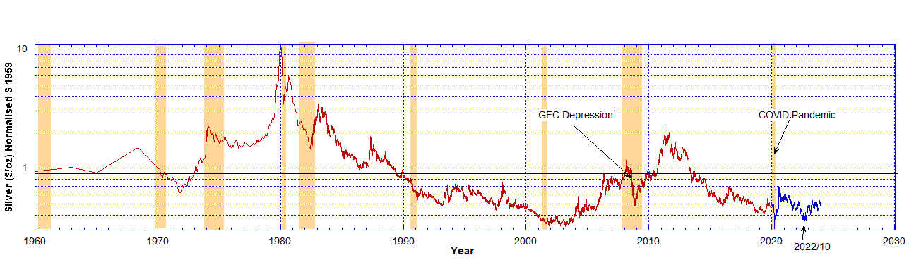 Chart 6: The price of an ounce of silver in 1959 dollars on linear axes. This is the same data from Chart 5 except a linear vertical axis is used. The red data are the price of silver ($/oz) scaled by the USD normalisation curve (1) and the blue data are scaled using curve (2) from Chart 2. The horizontal solid line is the $0.9 price for an ounce of silver from 1959. The sepia strips indicate recessions.