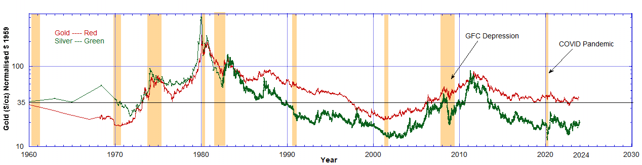 The price of silver in 1959 started at $0.90. The horizontal solid line indicates this level. Now that all dollars are 1959 dollars we can see the real price of silver over the past 65 years. Any time it dipped below 90 cents it was undervalued in real terms. Any time it was above that line it was higher in real value. Since 1990 it has been undervalued up until the present except between July 2010 and November 2013. Note the drop in the real price (in 1959 $ terms) of silver during recessions. Particularly note the price drops during the 2008 GFC Depression and the 2020 Covid Pandemic.
