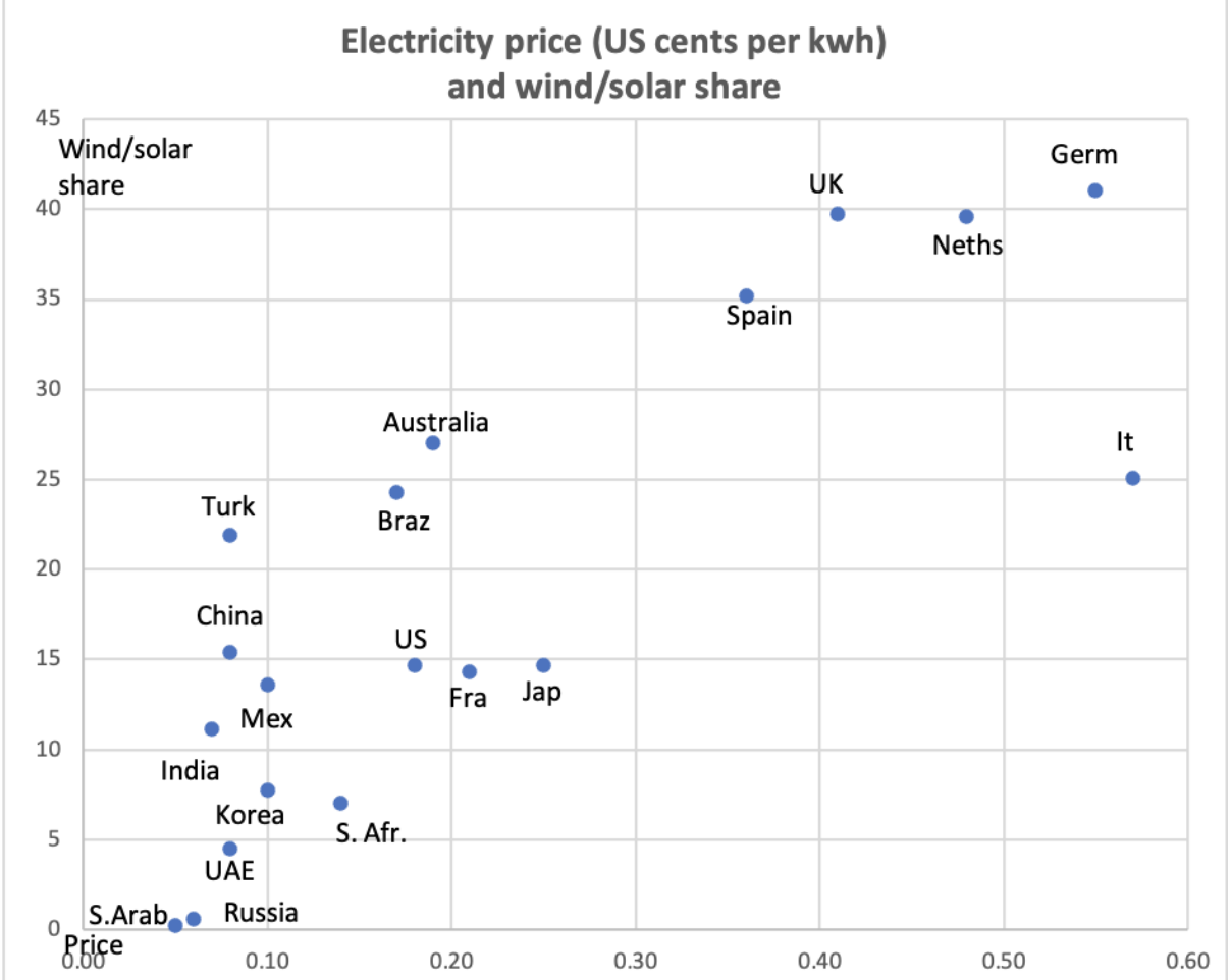 AEMO is signalling that after years of rising prices – punctuated only by Covid-induced demand reductions – we have turned the corner due to alleged low-cost renewables displacing those dinosaur coal generators. This is a familiar theme of the energy regulators, who have treated each price increase as a hiccough soon to be reversed. But, as AEMO’s data demonstrates, the greater the proportion of renewables has been accompanied by surging prices. As well as the long-term Australian trend, this association is corroborated by inter-country comparisons.