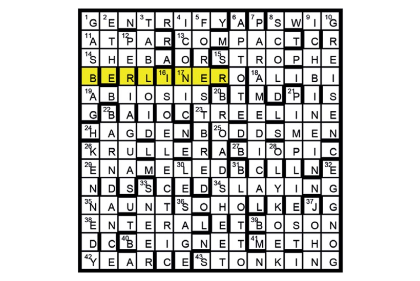 The key word is Berliner: 37D/26D said ‘9D Berliner’; 13A, 3D, and 20D are newspaper formats; 26A, 40A and 28D are doughnuts.
