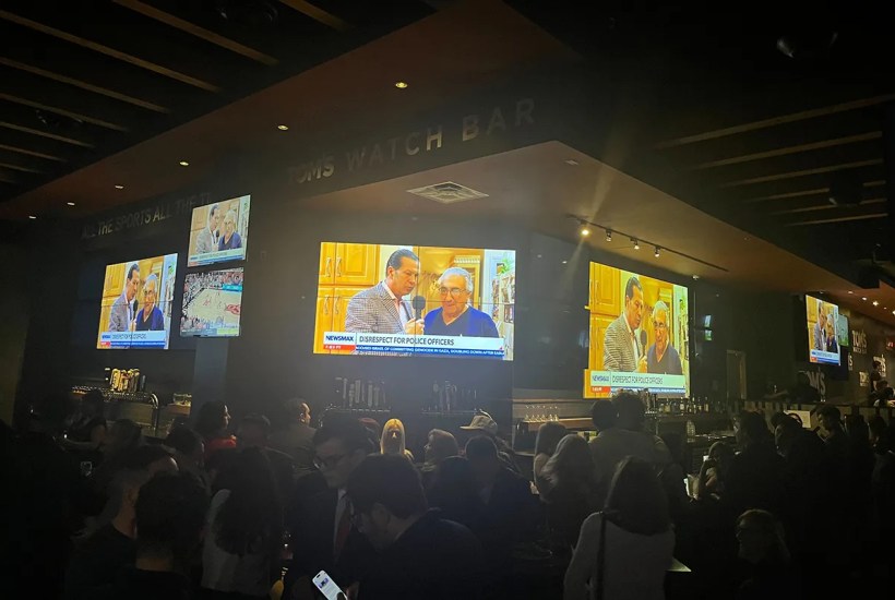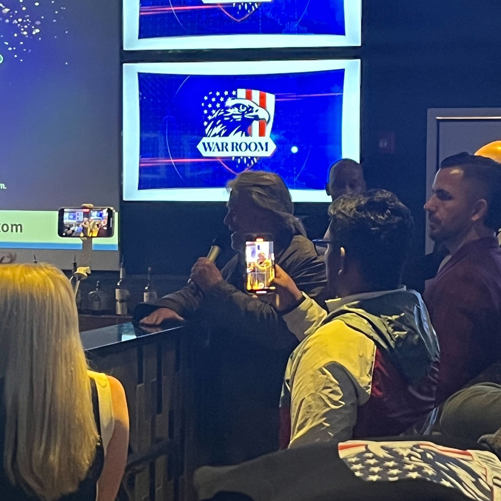 The party, hosted by Bannon’s podcast-turned TV show War Room, kicked off at 8 p.m.; it could have served as a South Carolina GOP primary watch party. But that race was called at 7 p.m. on the dot, with Trump delivering his victory speech before proceedings started. Instead the many big screens at Tom’s were rolling Newsmax re-runs, along with eclectic sports such as midget boxing, slap fighting and ostrich racing.