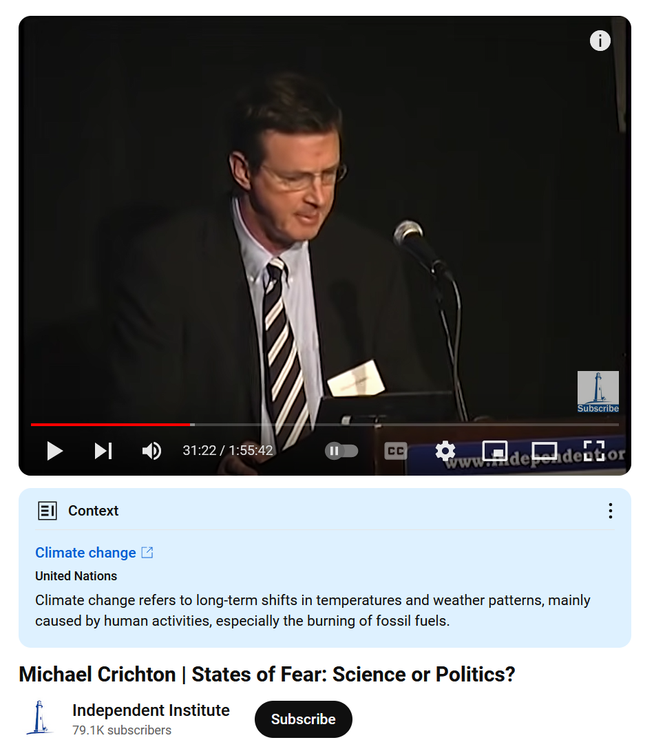 But if you want proof of Crichton’s thesis regarding the subversive nature of climate change politics, look no further than the message pinned to the bottom of all his YouTube videos, appearing under the heading of ‘Context’.