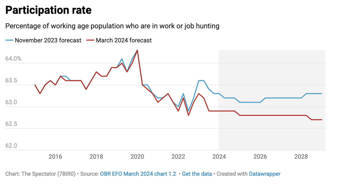 In headline terms, the OBR has abandoned its previous optimism that the spike in economic inactivity that followed the pandemic would be temporary. Based on data showing that inactivity rates remain stubbornly high, the forecasters now expect the participation rate to go on falling from its pre-pandemic peak of 64.3 per cent to 62.8 per cent by 2028.