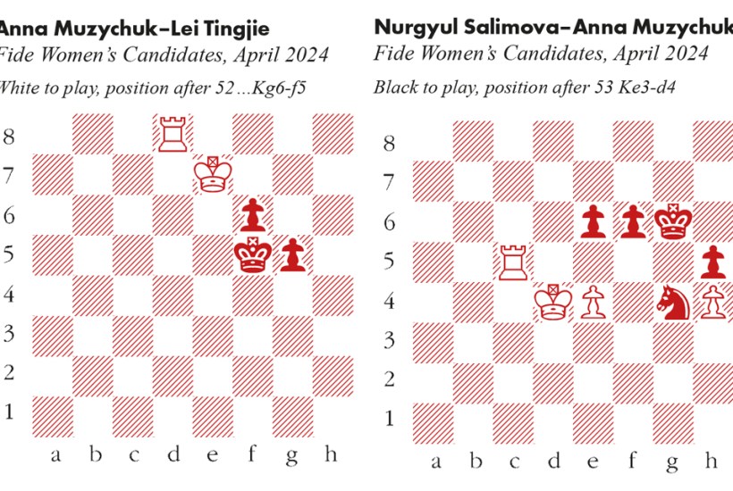 Just a few moves earlier, Anna Muzychuk had an extra pawn in a rook endgame, which was being patiently guided to victory. Lei Tingjie has sacrificed her rook to reach the diagram position, pinning her hopes on the passed g-pawn to salvage a draw. Crucially, her king can shepherd the pawn while also impeding the approach of the White king. Time is of the essence.