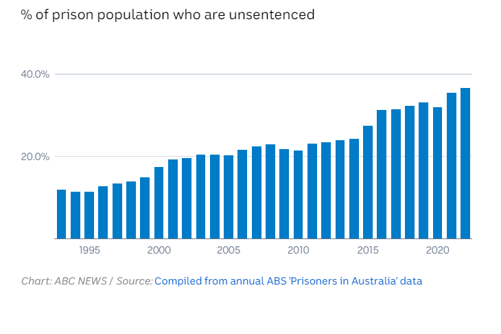 Right now, across this country more than a third of men in Australian prisons haven’t had their case determined by a court. In national trends, the number of unsentenced people in custody almost doubled, reaching 16,000 in the past decade. The proportion continues to go up – with a 15.5 per cent increase in the last five years.