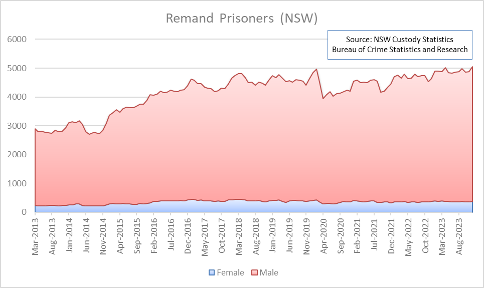 The consequence of these changes to bail laws is that the rate of bail refusals has increased by 47.3 per cent over last 9 years according to BOCSAR. This means more and more remand prisoners even though crime rates have been on a dramatic decline.