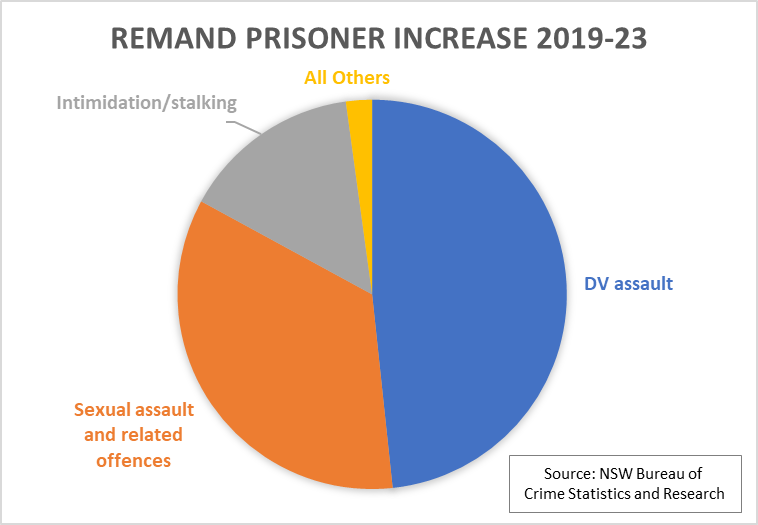 Yet the crimes the feminists have targeted – sexual assault, domestic violence, intimidation/stalking and the like – make up 98 per cent of the increase in remand prisoners in the last 4 years, according to data provided to us by BOSCAR. Domestic violence and sexual assault account for 83 per cent of the increase.