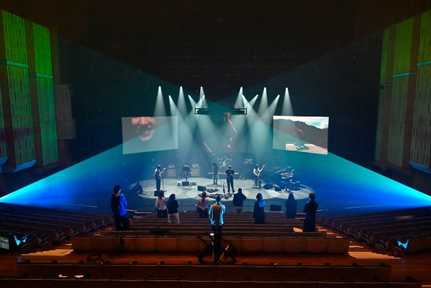 But we need to talk about the show, because the show was astounding. The trio played inside a low, white rectangular box situated on the Coliseum’s stage, open at the front and lined with LED bulbs that sometimes just lit them starkly, sometimes made the walls appear like mirrors, or showed rushing planets or retrofuturist graphics (there was no lighting directed at the stage; it all came from within the box), their little performance area wholly surrounded by darkness. From the front row of the Coliseum – and none of the reviewers in the front row could quite believe their good luck; it’s not usually like this – it was overwhelming, like looking through the windscreen of a car travelling at high speed. I’d be curious to know whether those in the gods found it quite as extraordinary as we did, or whether it was like watching something on a mobile phone from great distance.