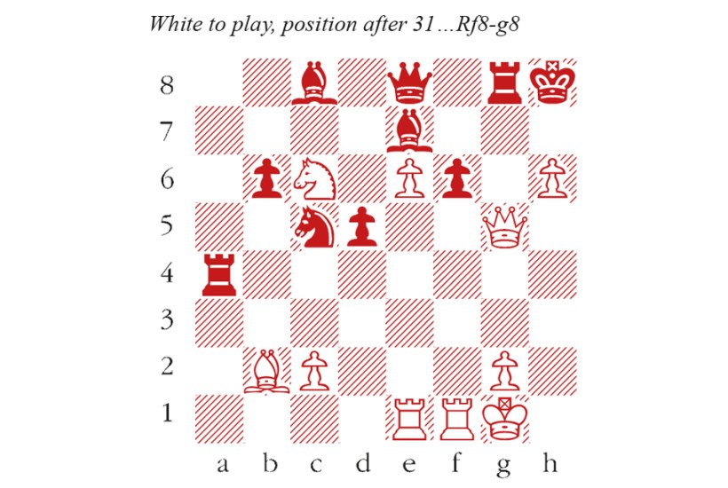 One quandary modern live commentators face is how much to use the instant feedback from chess engines. The evaluations, often presented as a thermometer-like ‘bar’ to the side of the board, offer an easy way for viewers to gauge what is going on. But explaining every minor fluctuation can distract from the flow, and can anyway be misleading, as the bar may present equality even when both sides are walking a tightrope. At other times, the swings heighten the excitement, as in this game from Toronto. In the diagram position, the crude 32 Bxf6+ was best, since 32…Bxf6 33 Qxf6+ Kh7 34 Ne7 creates overwhelming threats. But Tan was tempted by a more elegant move.