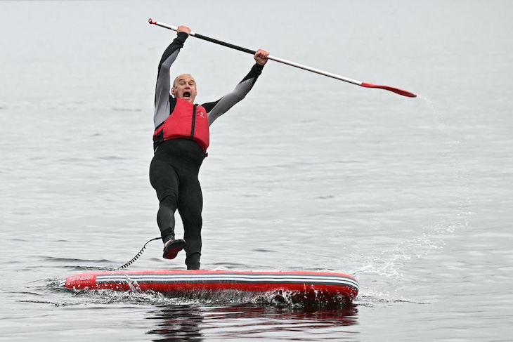 On Tuesday, he was pictured repeatedly falling from a paddleboard on Windermere in Cumbria – a stunt to highlight the issue of sewage dumping, apparently. On Wednesday, he was on a bike, peddling down a steep hill, ostensibly en route to the party’s Welsh campaign launch. ‘Having a wheelie great time,’ he tweeted.