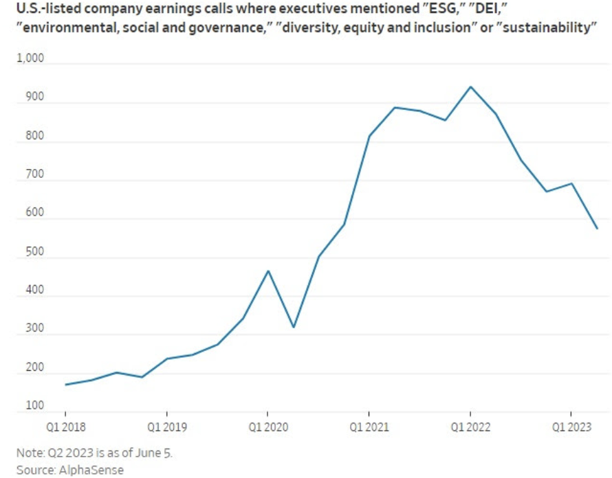 There are some indications that fund manager Wokeness is in decline. US listed companies have fewer mentions of the key acronyms (ESG and DEI) in recent years.