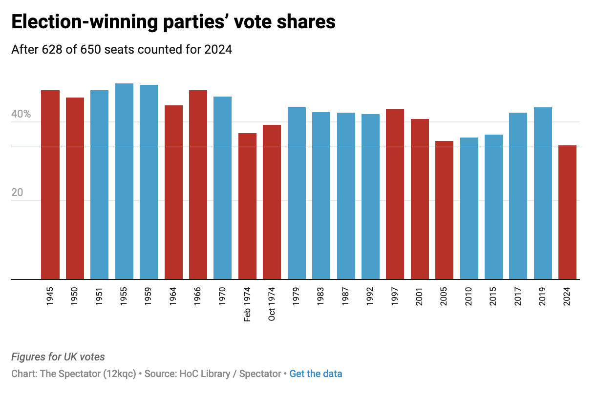 So far, something pretty big is missing from Labour’s historic landslide: voters. Keir Starmer is set to win 64 per cent of the seats but on only 34 per cent of the votes. Labour in 2024 has achieved just 1.5 percentage points higher than the Jeremy Corbyn calamity in 2019 – and less than Corbyn managed in 2017. A split in the right has seen the Tory vote share drop from 44 to 24 per cent, but most of that went to Reform (on 14 per cent). Labour’s huge majority disguises one of the smallest – if not the smallest – vote share won by any postwar governing party. Let’s look at the share of the vote by election-winning parties.