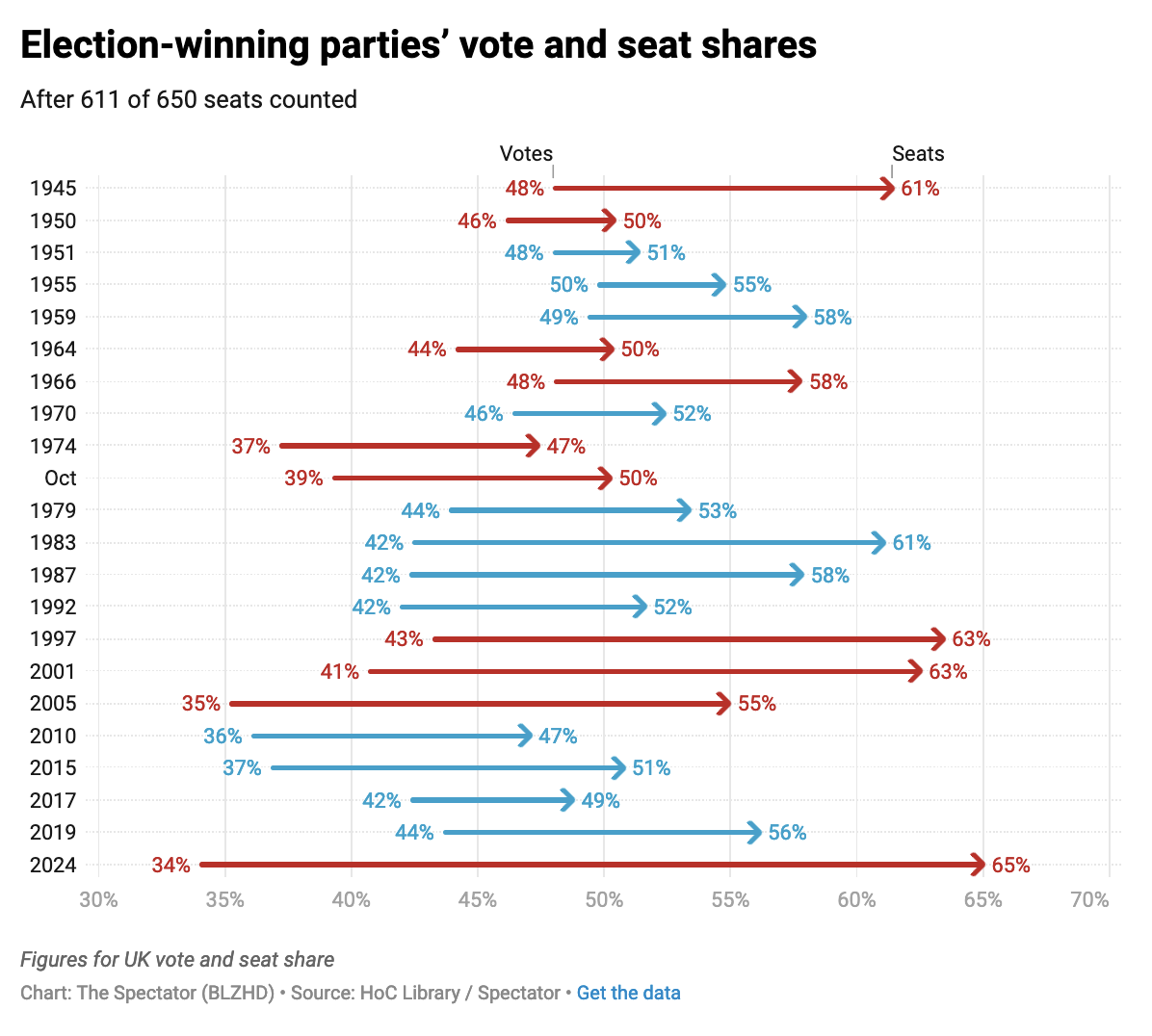 Where Starmer has done well is the translation of votes to seats: the Nigel Farage effect. Seldom has the first-past-the-post system been kinder to any governing party other than to Labour – that is to say, never has a modern governing party won so many seats with so few votes.