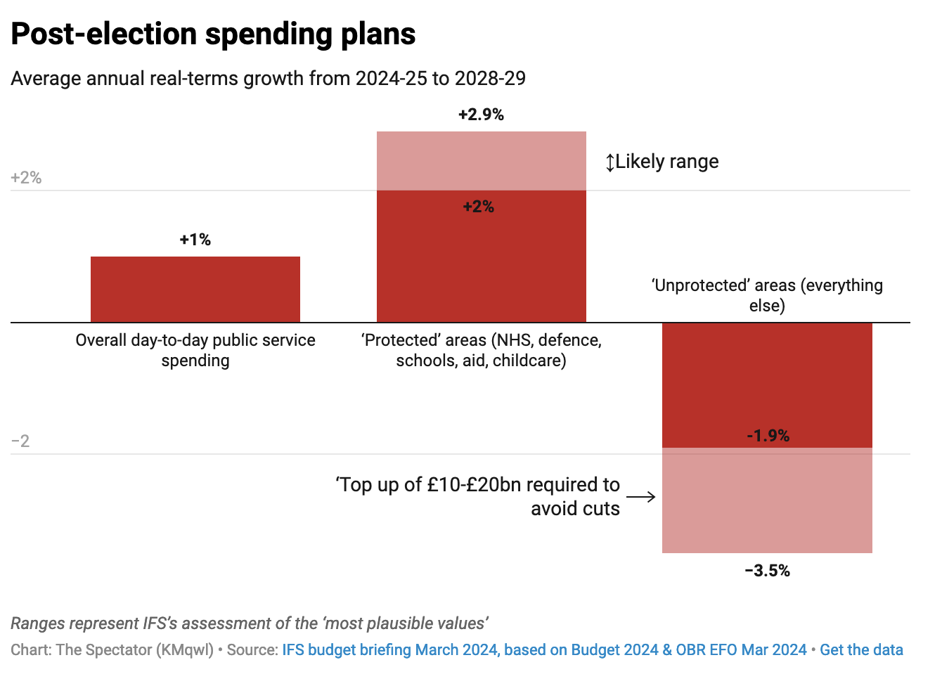 It seems much of what’s mentioned in the dossier falls in the grey area of political choice. The impact of double-digit inflation on both departmental spending and public sector pay, for example, has taken its toll. But the impact of inflation is not a surprise: rather it has been well-documented by the IFS, which calculated back in March that the Conservative’s pledge to increase public service spending by 1 per cent rise in the next Parliament would leave a £10-£20 billion black hole. It’s a figure neither the Tories or Labour wanted to engage with during the general election, despite being pushed to do so.
