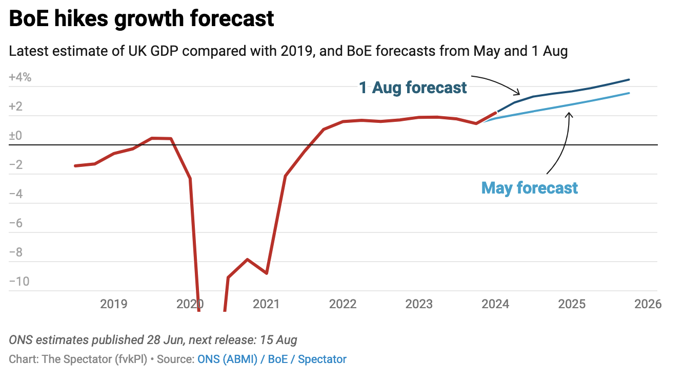 This meant that the first rate cut would likely be August or September – and benefit whoever was in charge. It was one of the reasons so many Tory MPs were baffled when the election was called for the summertime. The expectation was that summer would bring better economic news – and it did, including higher-than-expected growth rates in the spring, which have surely contributed to the BoE’s revisions (and serve as a reminder of how turbulent and shaky these forecasts tend to be).