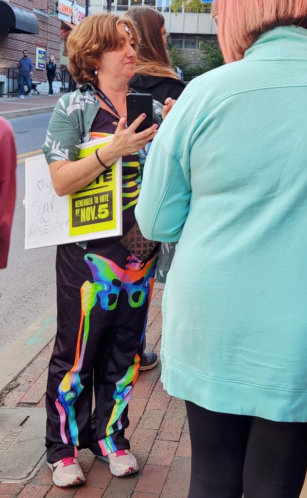 Standing at the very end behind a motley crew of gray long-hairs and colorful pixie cuts, Cockburn was one of only a few men. He obliged a fellow member of his sex by allowing him to snap his photo and send it to five people he knows in Pennsylvania who are registered to vote to remind them to do so. The volunteer taking photos was wheeling a wagon full of Celsius drinks and Red Bulls. The lesbian couple in front of Cockburn had their photos taken by a woman in a neon skeleton suit (Halloween, he hopes) advocating “reproductive rights.”
