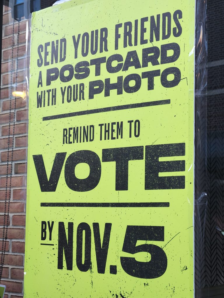 Cockburn asked the lesbians why they were voting for Kamala Harris. They looked at one other and waited for the other to answer. Finally, the more outspoken one said, “Because I am a WOMAN. An EDUCATED woman!” She added something about “being passionate,” and her partner said, “I’m not passionate; I’m nervous.” The man taking people’s photos to remind their friends to vote continued to try to push beverages on the people in line; when Cockburn remarked that it was strange he was only offering caffeinated drinks while it was nearing dusk, the man laughed nervously and encouraged him to take some.