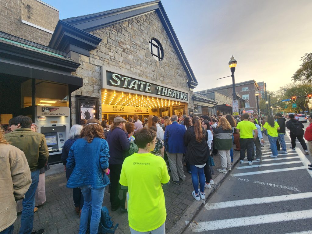 Cockburn wandered curiously up a bustling College Avenue in State College yesterday toward the State Theatre, where Representative Alexandria Ocasio-Cortez was set to take the stage and stump for the Harris-Walz campaign. He was waylaid along the way by a group of Republicans waving flags and ringing a cowbell alongside a cardboard cutout of Donald Trump. The “counter-protesters,” as they described themselves, were garnering numerous supportive honks and thumbs-up from cars driving by. They told Cockburn only one person had yelled an obscenity. So much for the Divided States of America!