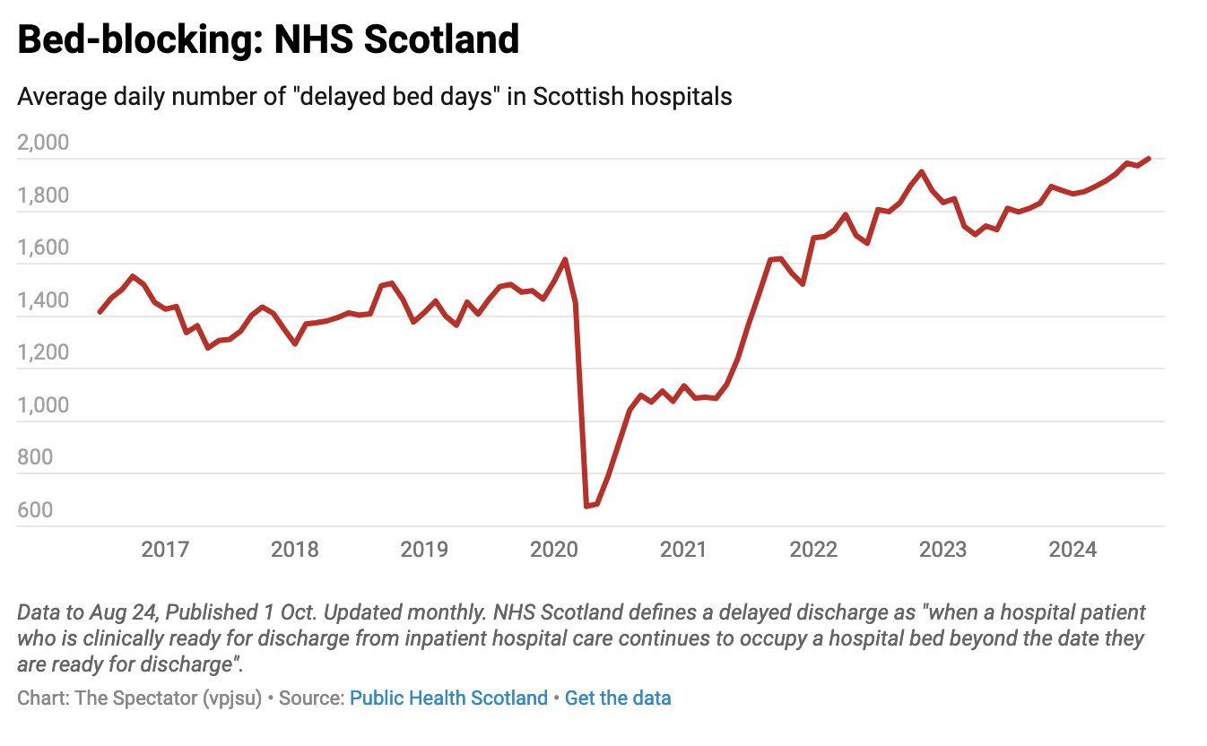 But it is now apparent that Sturgeon’s vision went no further than a back-of-a-fag-packet outline of an idea. Over the past three years, almost £30 million has been spent on what the Scottish government describes as ‘work related to the NCS’, yet neither ministers nor civil servants are at all clear about how the service might work in practice. Indeed, neither are able even to describe exactly what the NCS might look like. All the while, bed-blocking in Scottish hospitals continues to rise, with there being an average of 2,000 ‘delayed bed days’ in NHS Scotland’s secondary care facilities as of August 2024. The lack of a feasible fix to the country’s crippled care sector only means that congestion in Scotland’s hospitals will continue to worsen, with less beds available for incoming patients as they remain occupied by those who require a sufficient community care package to leave. It’s a mess that no one snappy acronym can solve.