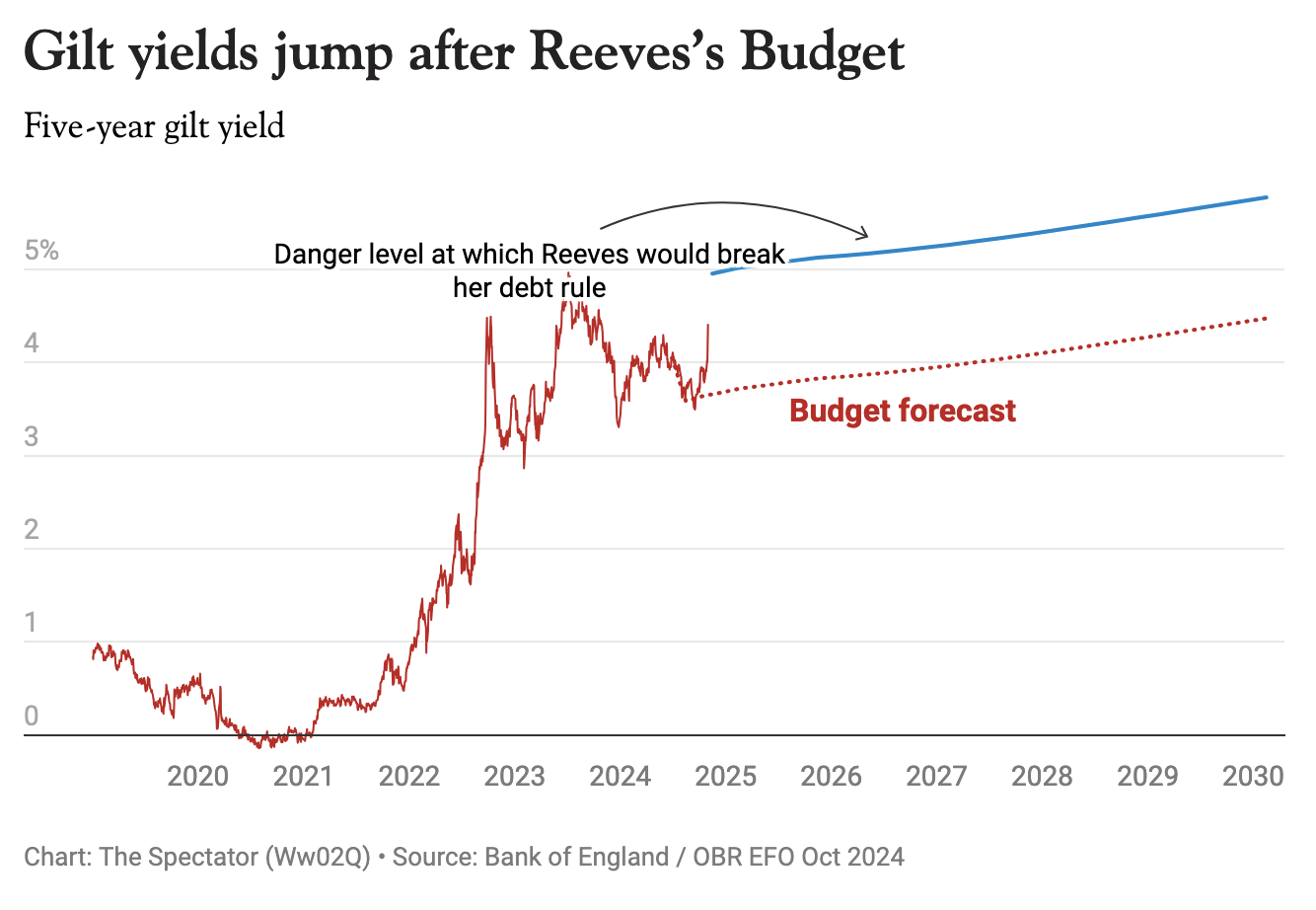 But the outstanding problem for Labour is that neither those reforms nor that growth has been clearly presented to markets. Despite lots of talk of reform in Labour speeches and public policy circles, the really big overhauls – including the NHS – have not had any detail attached to them yet. ‘For the first time the NHS Budget has tipped over £200 billion pounds a year’ the chief secretary said on Today, ‘but everyone recognises that the system is broken’. This may be a large part of the problem, and explain some of the market reaction: the NHS was just given a top-up of over £20 billion for day-to-day spending, without any mandate for improvements, lower waiting lists or efficiency gains attached to the money. With day-to-day spending ramping up significantly, not even the significant tax hikes are currently convincing markets that all the bills really are paid for – or that they’re not going to be asked for more cash in the future.