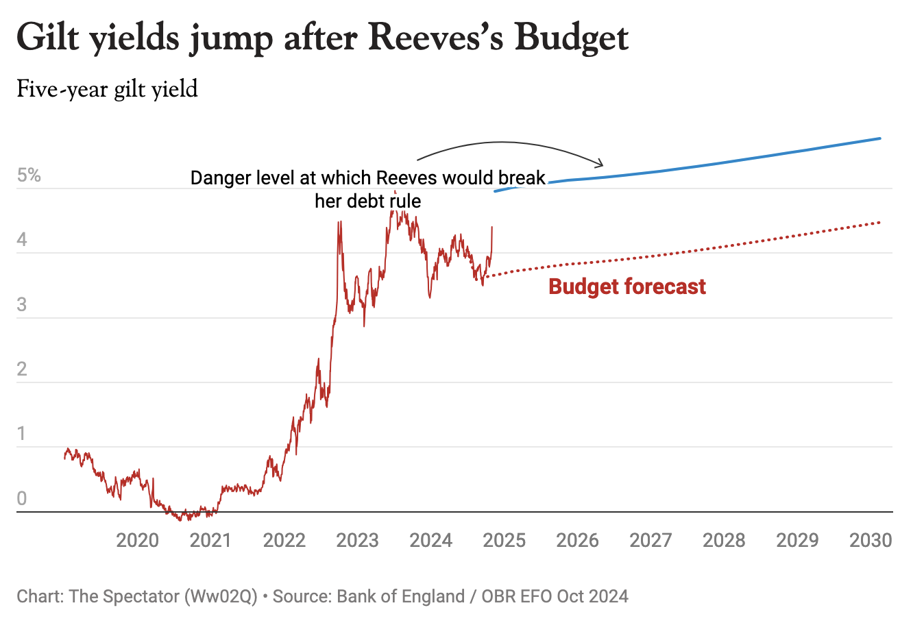 The more investors dig into Labour’s first Budget, the less they seem to like it. After the Office for Budget Responsibility published its assessment of the Chancellor’s measures yesterday afternoon, some immediate (and expected) volatility set in. But rather than settling down, market jitters seem to have worsened today, as a gilt sell-off saw government borrowing costs hit their highest level in 2024 this afternoon, with the 10-year gilt yield reaching 4.52 per cent and the five-year gilt yield reaching 4.41 per cent.