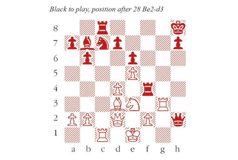 19…f4! would have posed huge problems to Caruana. For example, 20 Nxf4 Nxf4 21 Bxf4 Rxf4! 22 gxf4 g3 devastates the kingside, or 20 gxf4 g3 21 Rg2 Nc3! 22 bxc3 Bxg2+ 23 Kxg2 gxf2+ 24 Kxf2 Bh4+ and again the attack is too strong. 20 Bxg5 Qxg5 21 Ke1 f4 22 Qd2 Qg6 23 gxf4 g3 24 Rg2 Qxh6 25 Rxg3 Nxf4 26 Nxf4 Rxf4 27 Ne3 Qh2 28 Bd3 (see diagram)