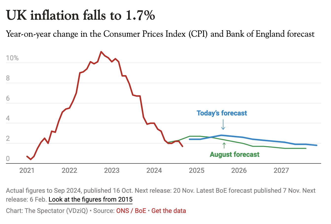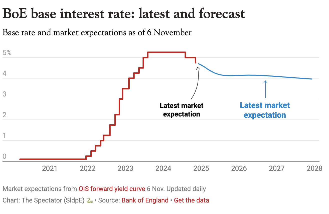 Still, today’s rate cut and report is good news for the government overall, which has been facing warnings that unsteady reactions to the Budget could mean rates remain higher for longer than previously anticipated. It’s still possible the reaction to the Budget will slow rate cuts over a longer period of time, especially if gilt yields don’t show signs of reducing or if inflation meaningfully ramps up again: the Bank also notes that decisions made in the Budget, including the ‘rise in the cap on single bus fares from £2 to £3 and the introduction of VAT on private school fees from January, and the increase in Vehicle Excise Duty from April’ will all contribute to an uptick in inflation from the start of next year – and the Bank has revised its forecast for inflation in the fourth quarter up from 2.2 per cent to 2.7 per cent.