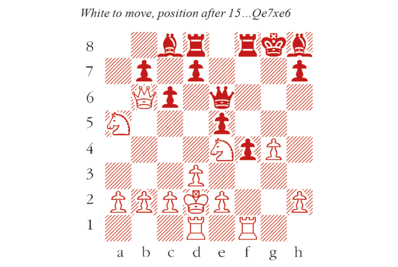 1 f4 Nb6 2 Nc3 f5 3 Nb3 Na6 Caruana would have preferred to play 3…Nc6, but then 4 Nb5!, hits c7, whereupon 4…Nd5 5 c4 is awkward or 4…Na8 5 Nxa7 snags a pawn. In the opening of a Freestyle game, players learn to be wary of quirky tactical shots. 4 d3 c6 5 Be3 g5 6 fxg5 e5 7 g4 f4 8 Bxb6 axb6 9 Qxb6 Qxg5 Caruana’s pawn sacrifice has netted him the bishop pair and hopes for central expansion with d7-d5. Carlsen will soon anticipate that with Bh1-e4-f5, so that his bishop doesn’t get stuck on h1. 10 Na5 O-O Freestyle castling rules are peculiar. Here, the Black king moves from e8 to g8 and the rook remains on f8. 11 Be4 Qh4+ 12 Kd2 Qe7 13 Bf5 Nc5 14 Ne4 Ne6 15 Bxe6+ Qxe6 (see diagram) 16 Nxb7! This pawn grab looks risky, due to the imminent Rd8-b8xb2, but Carlsen correctly judged that he has little to fear. Either the queens will be exchanged, or he will capture the d7-pawn, which secures the Ne4 and consigns the Bh8 to passivity. Bxb7 17 Qxb7 Rb8 18 Qc7 Rxb2 18…d5 19 Qxh7+ Kxh7 20 Ng5+ Kg6 21 Nxe6 favours White. But 18…Bf6 was worth considering. For example, 19 b3 Be7! prepares counterplay with d7-d5 or Rfc8/Rb8-a8 19 Rb1 Qxa2 20 Rxb2 Qxb2 21 Qxd7 With an extra pawn and a glorious central knight, Carlsen is firmly in control. Qb4+ 22 c3 Qb2+ 23 Ke1 Bg7 24 Qe6+ Kh8 25 Rf3 Allowing the queen intrusion looks scary, but it leads to nothing. Qc1+ 26 Kf2 Qh1 27 Rh3 f3 28 exf3 Rb8 29 g5 Rb2+ 30 Kg3 Qg1+ 31 Kh4 An unusual but effective bolthole for the king. Rb8 32 Nd6 Black resigns In the second game, Caruana came close to equalling the score, but Carlsen saved a difficult rook endgame to secure victory by 1.5-0.5.