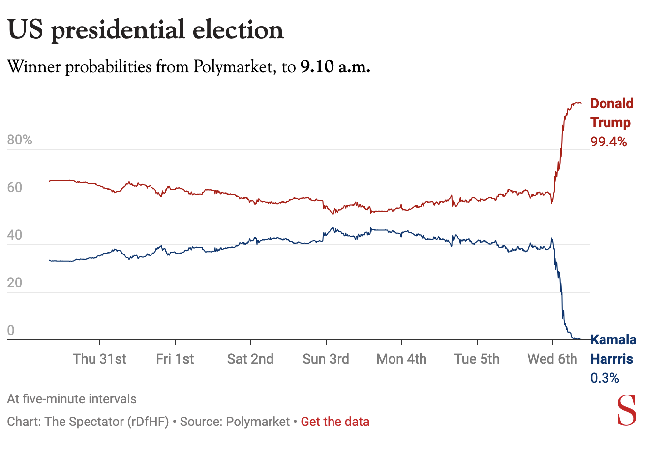 Trump is headed to the White House. As I write, that is the consensus of almost all political experts, including the New York Times’ Nate Cohn, who puts Trump’s chance of victory at greater than 95 per cent. Trump is set to pick up at least one – and possibly all three – of Michigan, Wisconsin and Pennsylvania. It is not confirmed yet, but it looks likely Trump will win all seven swing states.
