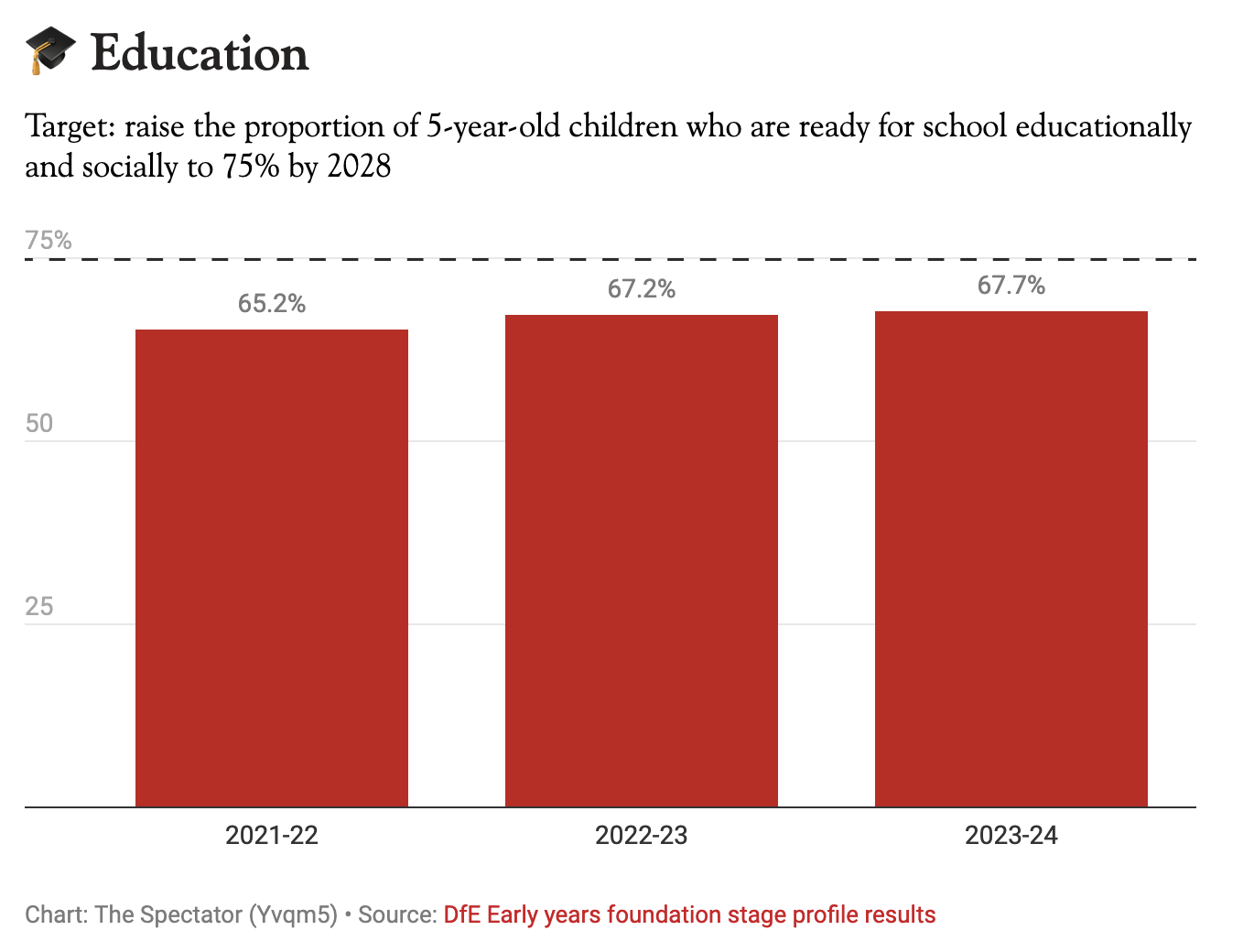 To give every child the best start in life, Starmer wants 75 per cent of 5-year-olds starting school ready to learn by 2028, up from 67 per cent at the last count. The Levelling Up white paper target looked at what pupils achieve at the end of primary school rather than before they start, aiming for 90 per cent of children achieving the expected standard – as well as demanding that the third of worst-performing local authorities improve their results by at least a third too. When the white paper was published, the latest figures showed 65 per cent of pupils reaching the standard in 2019.