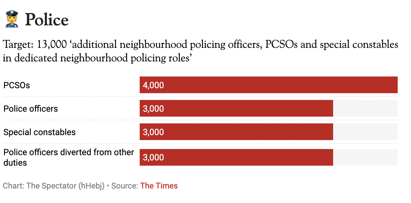 The latest crime target is 13,000 more neighbourhood police. Reports say that 3,000 of them will be new police officers, 4,000 will be new PCSOs, 3,000 will be new special constables and 3,000 will be police officers moved from other roles. (Labour also plans to halve knife crime and violence against women and girls within a decade.) The levelling up white paper metrics were reductions in the levels of neighbourhood crime, homicide and hospital admissions for stabbings, with a focus on the 5 per cent of areas where a quarter of neighbourhood crimes happen.