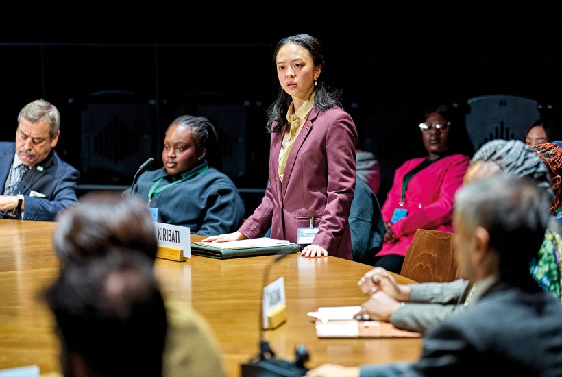 The authors, Joe Robertson and Joe Murphy, aren’t up to the job and their script is a blank list of speeches and events read out by soulless busybodies. It might have been written by a stenographer. For two and a half hours, the characters sit at a conference table waving their arms around and shouting at each other. Admirers of racial stereotyping will find much to enjoy here. The white characters are all calm, eloquent and authoritative. The non-whites are surly, charmless and hysterical. A plump Tanzanian woman demands reparations and declares that her fellow Africans are skinny because all the food has been eaten by westerners. A crazed delegate from Polynesia rants about flooding. ‘We will not drown in silence,’ she shrieks. A comedy Spaniard provides light relief by mangling his English. ‘Let’s keep our eyeses on the prizes,’ he says. He takes a siesta every afternoon, of course. An arrogant British diplomat worries that some attendees can’t understand acronyms. ‘Translation for the morons in the room,’ he says, referring to the third-world delegates.