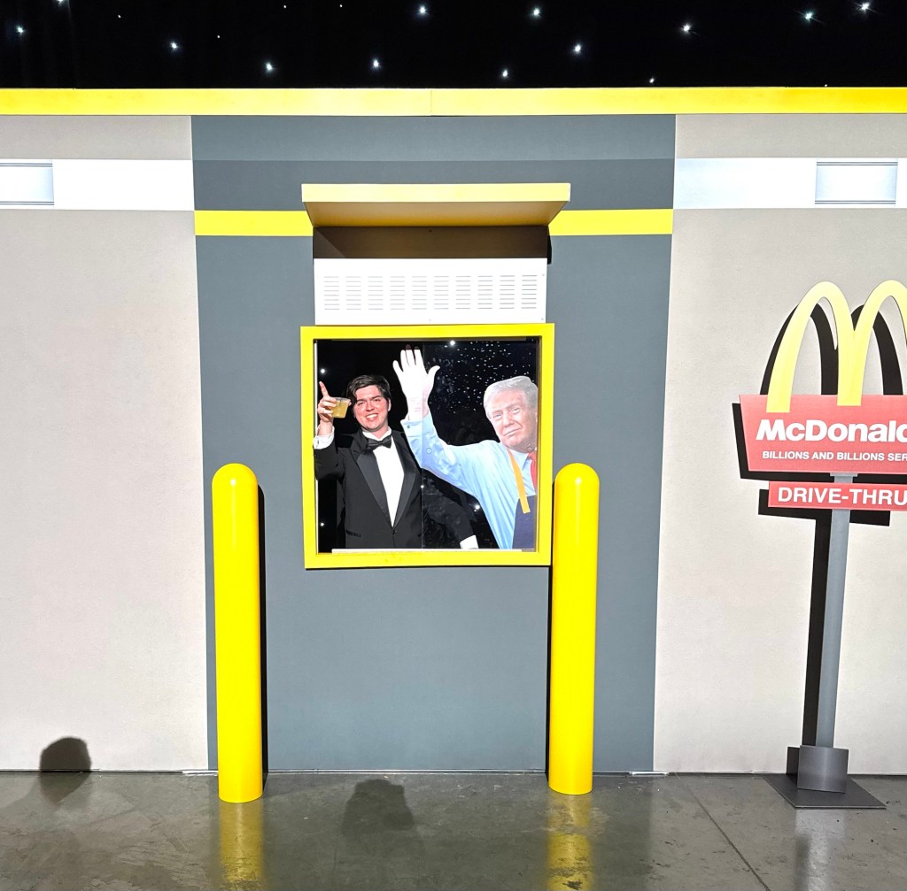 As we descended into the star-lit room, we were first greeted by screens of President Trump doing his iconic dance. Folks would record themselves slowly punching the air in front of it. But that wasn’t the most-loved attraction. At the other end of the room, there were four photobooths; “A Year in the Life of Trump” the lineup was called. The first one allowed you to take your own mug shot next to the president’s famous mug shot. The next one had a cutout of Trump waving from a McDonald’s drive-thru. The next two included a podium and a resolute desk.